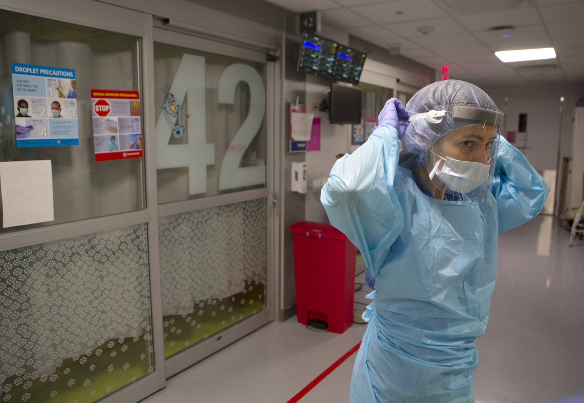 A clinician in a COVID-19 unit reaches for an isolation gown and a mask.