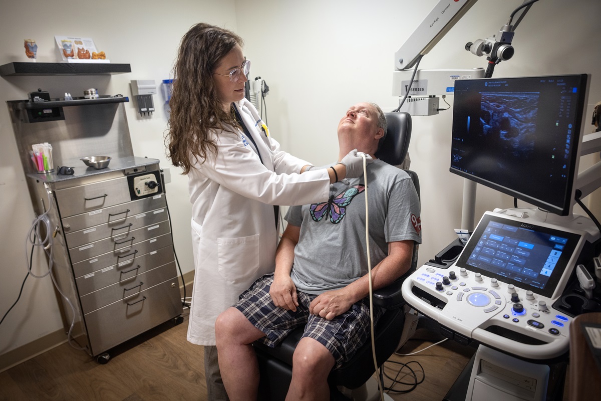 Dr. Emily Funk of Penn State Health Otolaryngology – Head and Neck Surgery performs a neck ultrasound on patient Tom Murphy nine months after his thyroid cancer surgery.