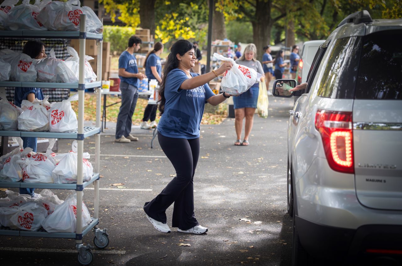 “I wanted to contribute to getting food to members of the community that may be suffering from food insecurity and learn more about their unique struggles, to better inform future outreach,” said Paige Roeschenthaler, who volunteered at the food distribution event.
