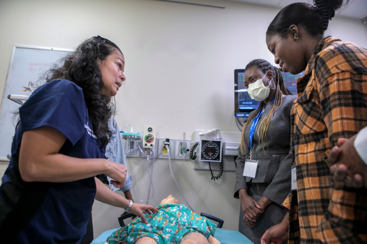 Dr. Lilia Reyes, left, works with Daniah Moultrie, center, and Aaliyah Lucius from Towson University in the Clinical Simulation Center at Penn State College of Medicine during the Minorities in Medicine program in 2023.