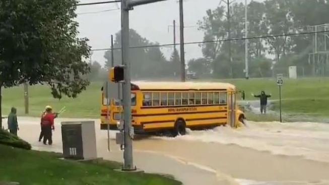 Staff members grew concerned when they saw a school bus filled with students from the nearby Janus School stalled and stuck in turbulent rising waters at the intersection of Route 230 and Lefever Road.