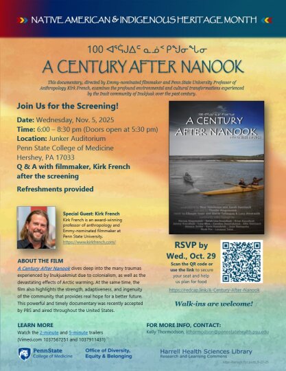 Junker Auditorium - Penn State College of Medicine 700 HMC Crescent Road, Hershey, PA, United StatesThis documentary, directed by Emmy-nominated filmmaker and Penn State University Professor of Anthropology Kirk French, examines the profound environmental and cultural transformations experienced by the Inuit community of Inukjuak over the past century.